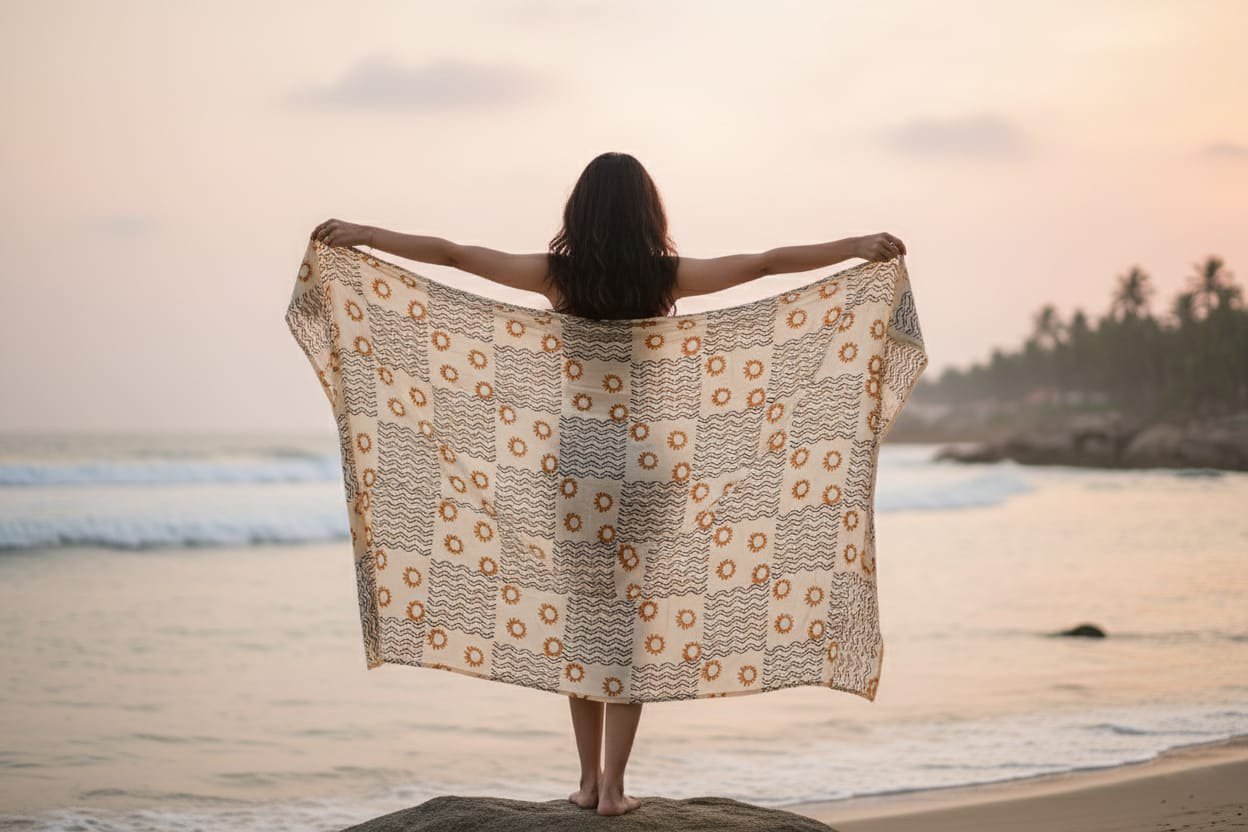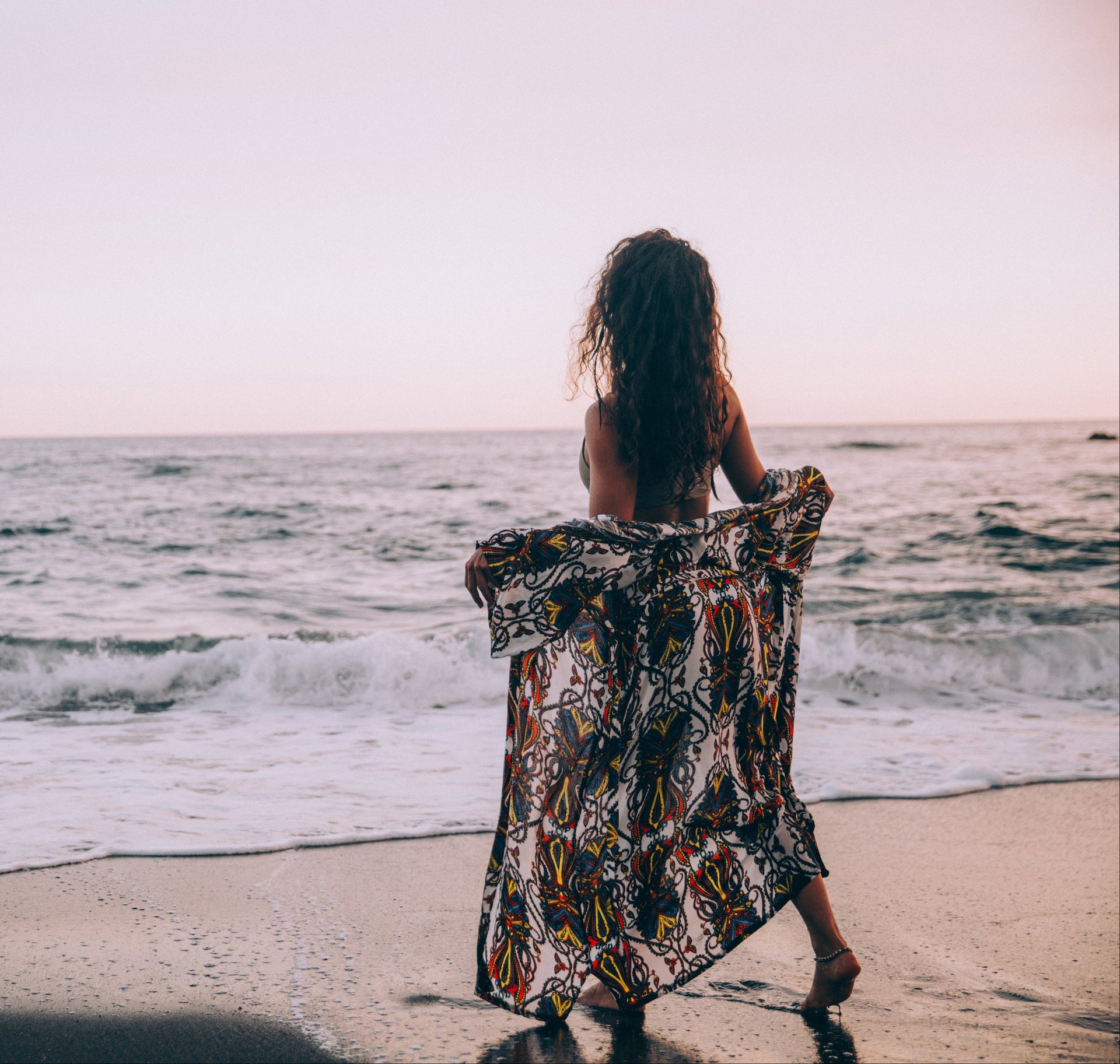 Woman on a beach holding a blue and white floral towelWoman on a beach holding a blue and white floral towel