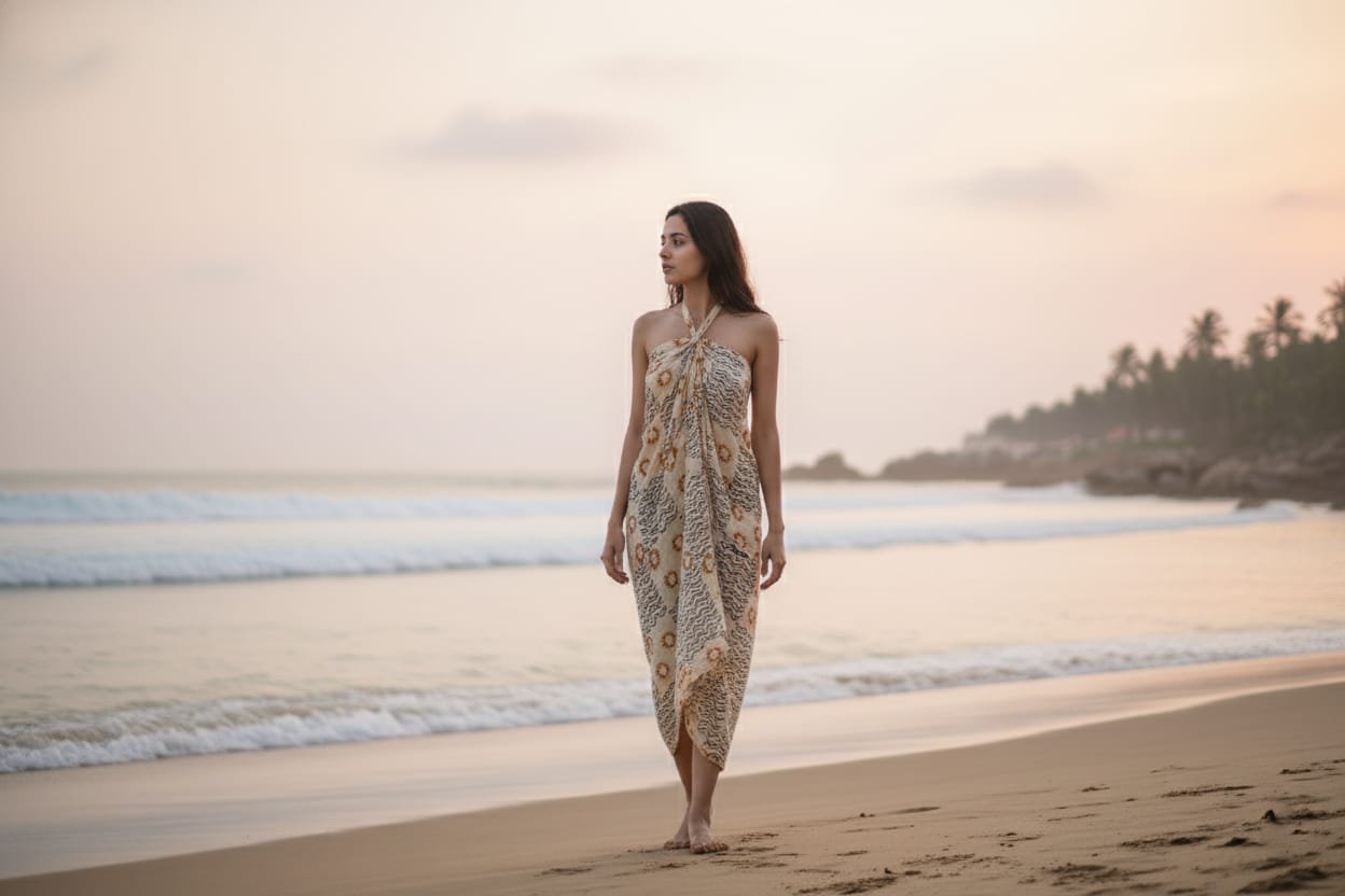 Woman in a white bikini top and pink sarong standing on a beach at sunset.