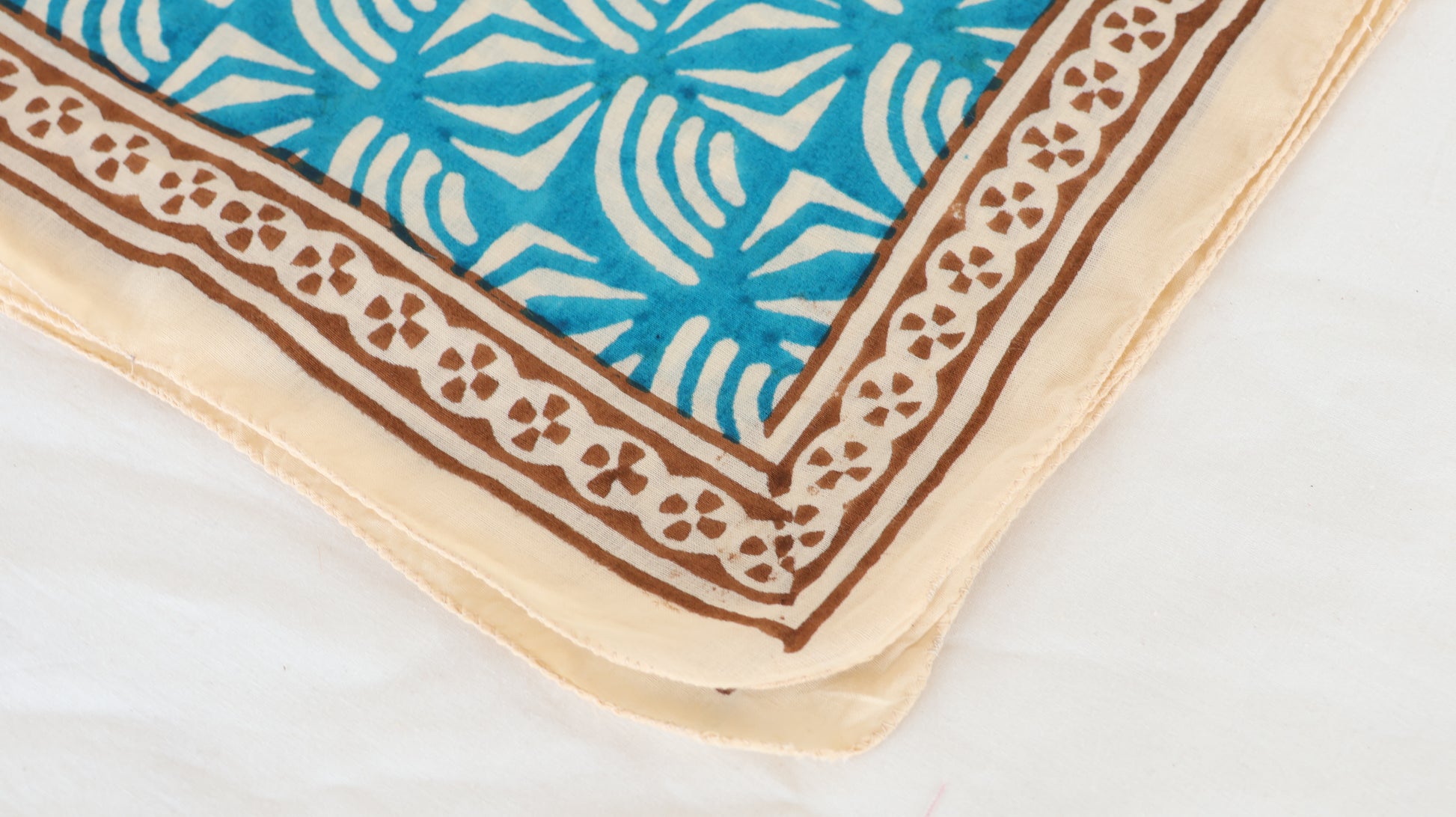 Add a touch of traditional artistry to your look with this beautiful Hand Block Printed Cotton Bandana. Crafted by skilled artisans, this bandana features a stunning geometric floral print in soothing tones with a detailed brown border. Made from 100% pure cotton, it feels soft and breathable — perfect for everyday wear, travel, or accessorizing your outfits.